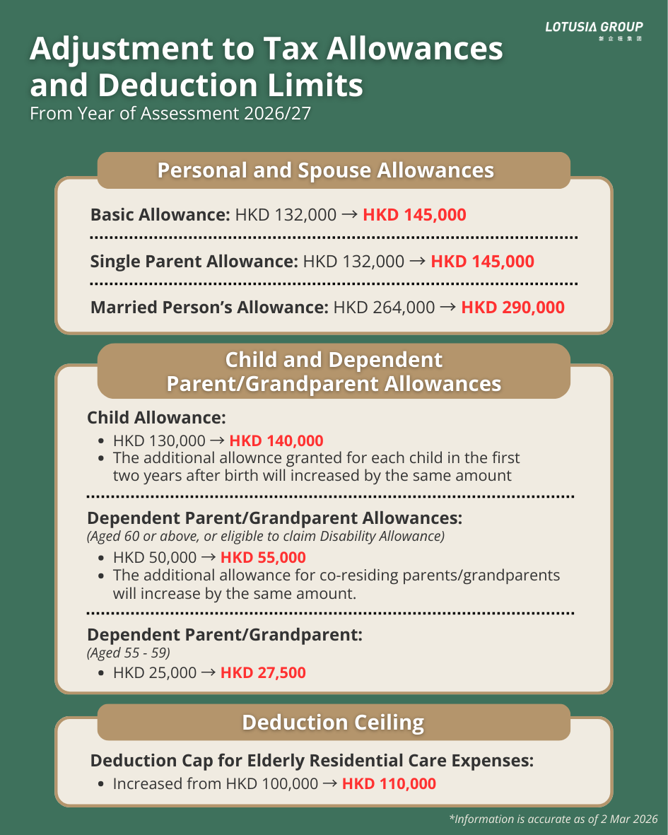 The budget provides a one-off 100% reduction in salaries tax, profits tax and tax under personal assessment for the 2025/26 year of assessment, subject to a cap of HKD 3,000 per case. It also increases several personal allowances, including the basic allowance, married person’s allowance and child allowances. The deduction ceilings for elderly residential care expenses has been raised.